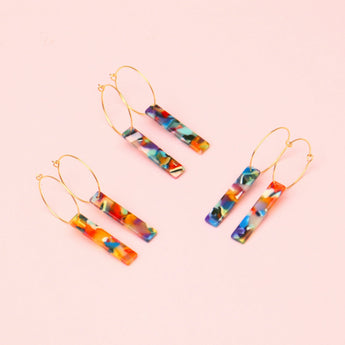 Diese bunten Hängeohrringe sorgen für einen wunderschönen Farbklecks in deinem Outfit. Ob als stylishe Ergänzung zum Freizeitlook oder als Eyecatcher auf der PartyDank - diese Ohhänger sind der passenden Begleiter für jeden Anlass. Dank des wunderbare leichten Materials (Cellulose Aceatat) sind sie kaum spürbar, wenn du sie trägst. Die Ohrstecker sind vergoldet und haben Stifte aus hypoallergenem Edelstahl (gut für sensitive Ohrläppchen).