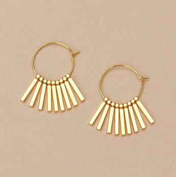 Elegante Bewegung trifft funkelnden Glanz! Diese wunderschönen Ohrringe bestehen aus kleinen, vergoldeten Stäbchen, die an vergoldeten Creolen hängen. Die Fransen schwingen  sanft und verleihen den Ohrringen einen luxuriösen Look. Perfekt für alle, die ihrem Style einen Hauch von Glamour und verspieltem Charme hinzufügen möchten – ob zum Ausgehen oder als Statement-Piece im Alltag.