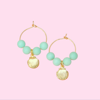 Mit diesen Hängeohrringen träumst du dich zurück an den letzten Urlaub am Meer. Die vergoldeten Creolen sind verziert mit kleinen, vergoldeten Muschel-Anhängern und mintfarbenen Jadeperlen. Einzigartig schön. Gönne sie dir, du wirst sie lieben.