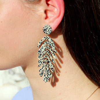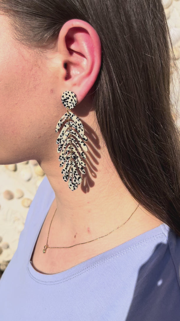 Schmücke dich effektvoll mit diesen einzigartigen hängenden Ohrringen in Blattform im Dalmatiner-Muster. Ihr auffälliges Design verleiht jedem Outfit eine wilde, individuelle Note und zieht garantiert alle Blicke auf sich. Perfekt für alle, die mit Stil und Selbstbewusstsein glänzen wollen.