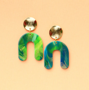 Bring Farbe in deinen Look mit unseren Statement Ohrringen 'COSMIC JUNGLE'! Die Farben Grün, Blau, Gold und Weiß verschmelzen bei diesen Ohrhängern in wunderschöner Weise und das geometrische Bogen-Design macht sie zu einem echten Blickfang. Dank des tollen Materials Cellulose Acetat sind sie natürlich, wie die meisten unserer Schmuckstücke, super leicht zu tragen. Die Ohrstecker sind aus hochwertig vergoldetem Messing.