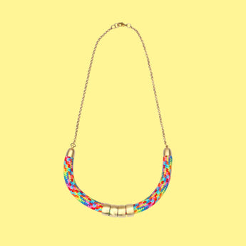 Diese bunte, chunky Statement-Kette ist ein echter Blickfang! Trage sie, um ein schlichtes Outfit aufzuwerten oder um an einem besonderen Anlass aufzufallen. Die Kette besteht aus hochwertigem Polyamid-Seil und goldfarbenen Messing-Elementen. Die Regenbogenfarben des Seils und der warme Goldton des Messings ergeben eine einzigartig schöne Optik.